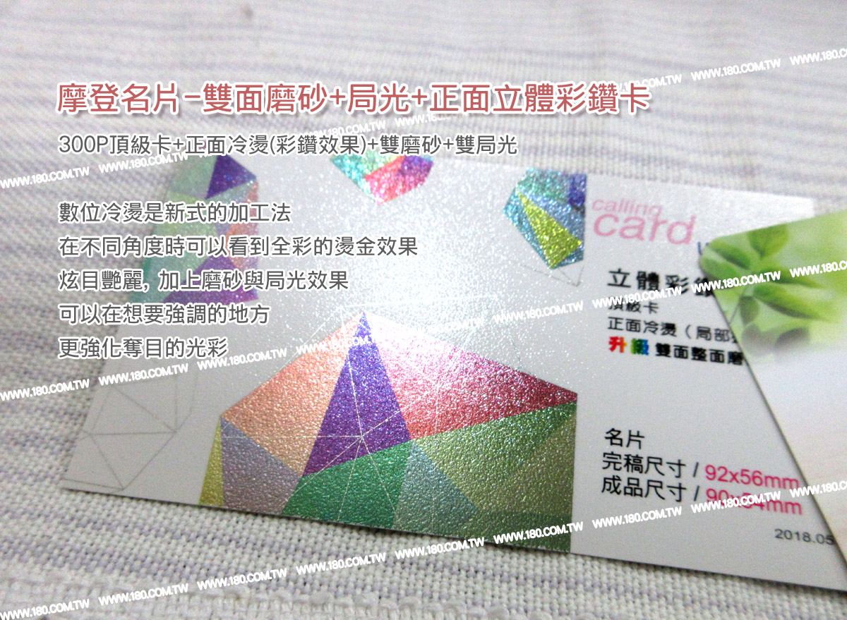 摩登285磅雙面磨砂+正面彩色金鑽雙面磨砂, 正面在您指定的地方 做彩色金鑽效果。 感覺就像是彩色燙金 非常炫麗適。 紙張實品拍照, 因顏色與光線角度, 印刷存在差異 |